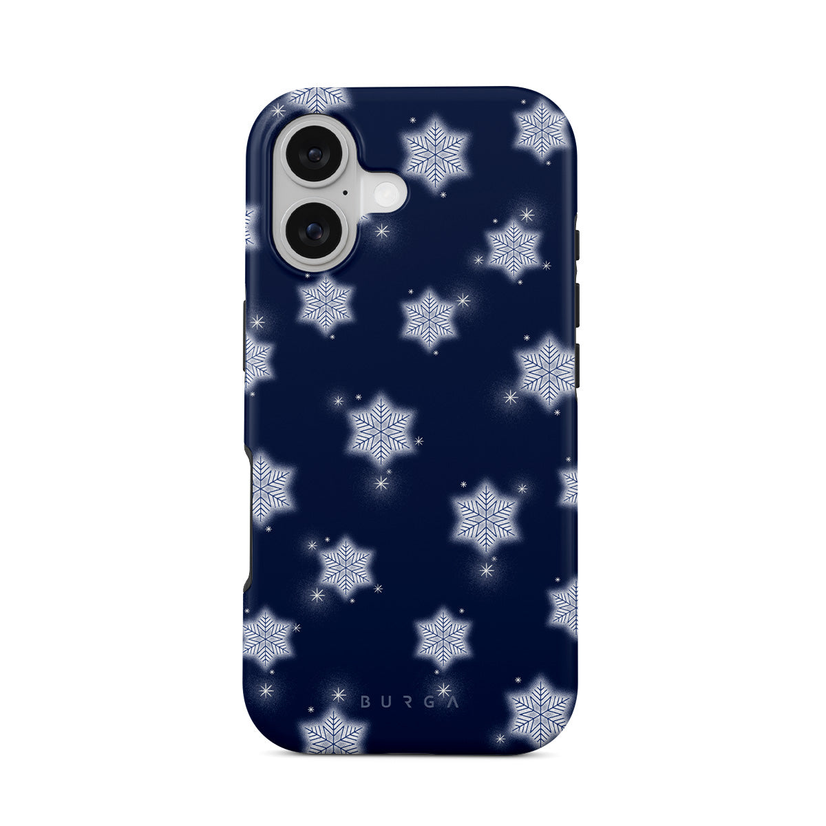 このデザインの特徴:白い雪の結晶、ネイビーブルーの背景、冬の雪の結晶模様、幾何学的な雪の結晶、クラシックな冬のデザイン