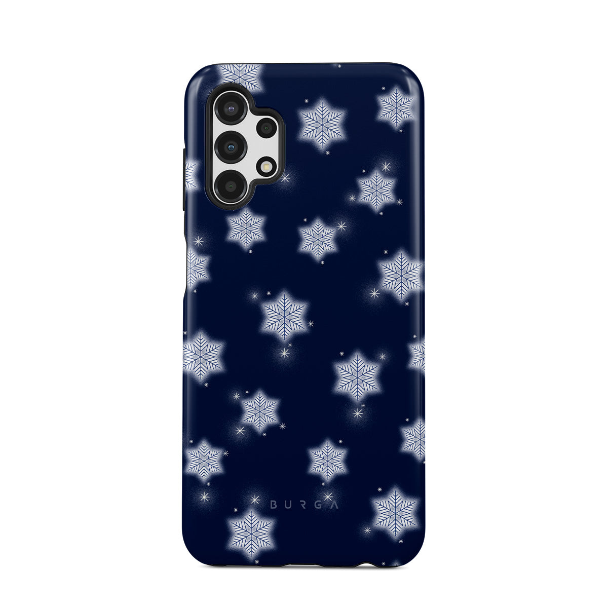 このデザインの特徴:白い雪の結晶、ネイビーブルーの背景、冬の雪の結晶模様、幾何学的な雪の結晶、クラシックな冬のデザイン