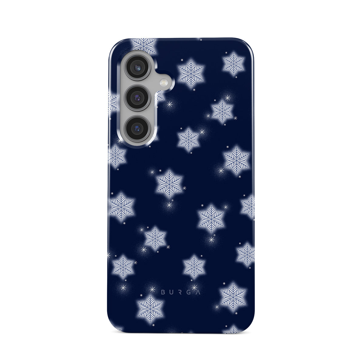 このデザインの特徴:白い雪の結晶、ネイビーブルーの背景、冬の雪の結晶模様、幾何学的な雪の結晶、クラシックな冬のデザイン