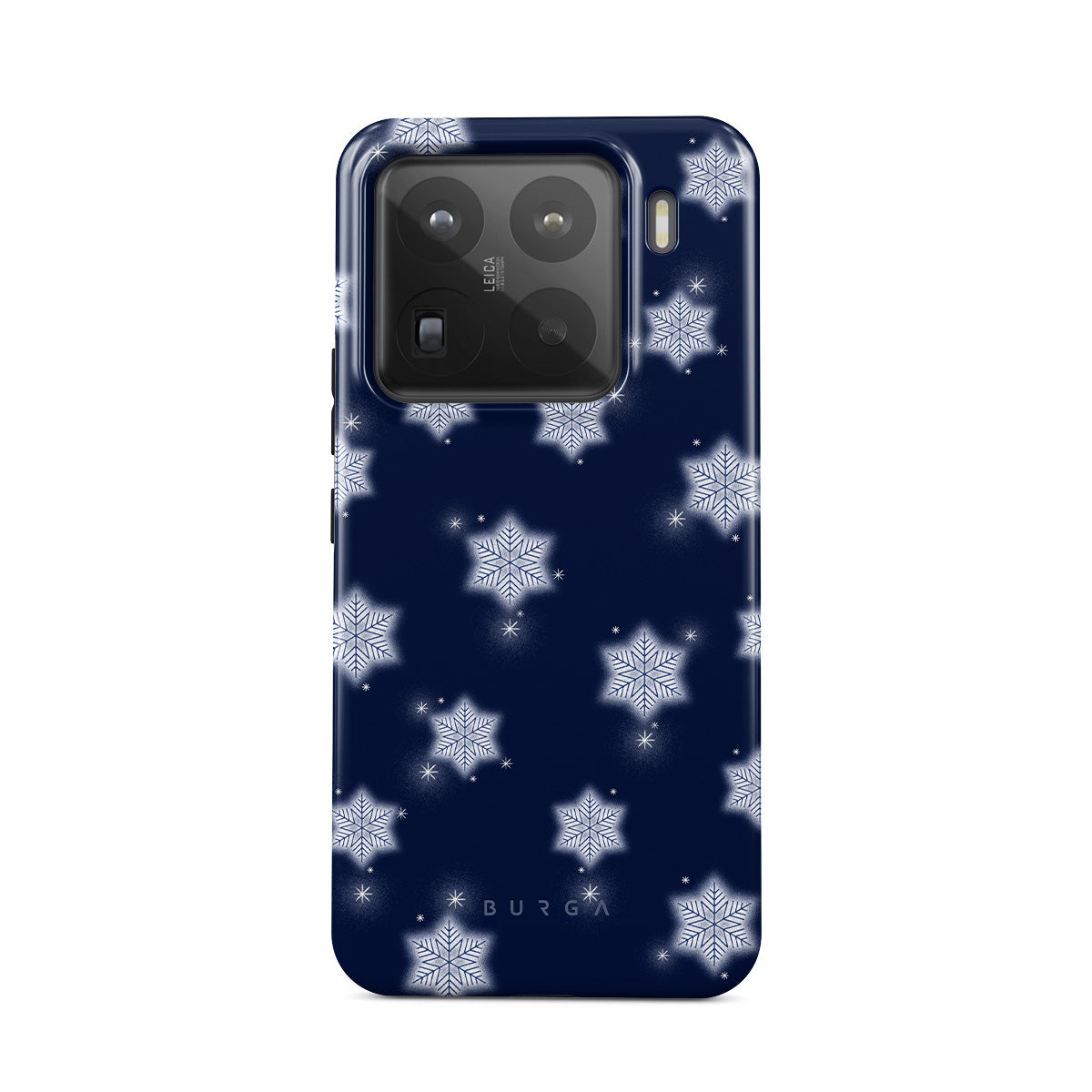 このデザインの特徴:白い雪の結晶、ネイビーブルーの背景、冬の雪の結晶模様、幾何学的な雪の結晶、クラシックな冬のデザイン