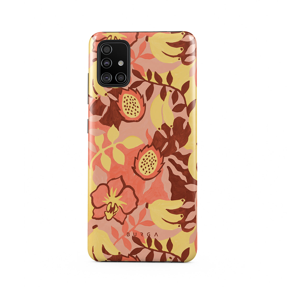 このデザインの特徴:バナナ、グアバ、マンゴー、トロピカルフルーツパターン、花