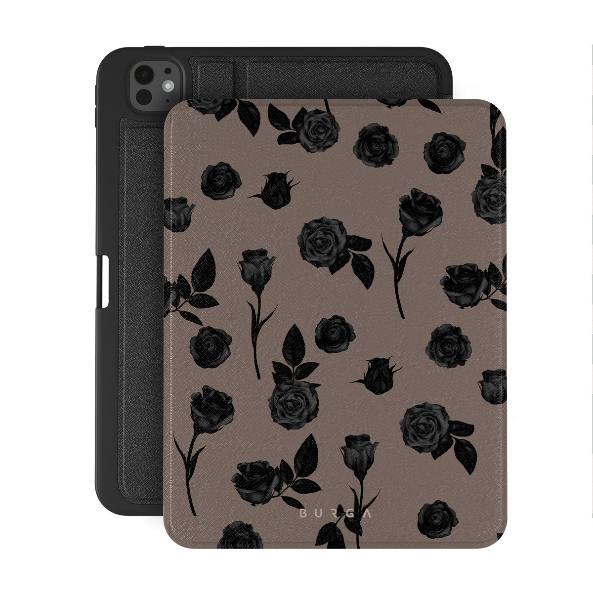 このデザインの特徴は、黒いバラ、大地の色調、フローラルディテール、ダークな花々。