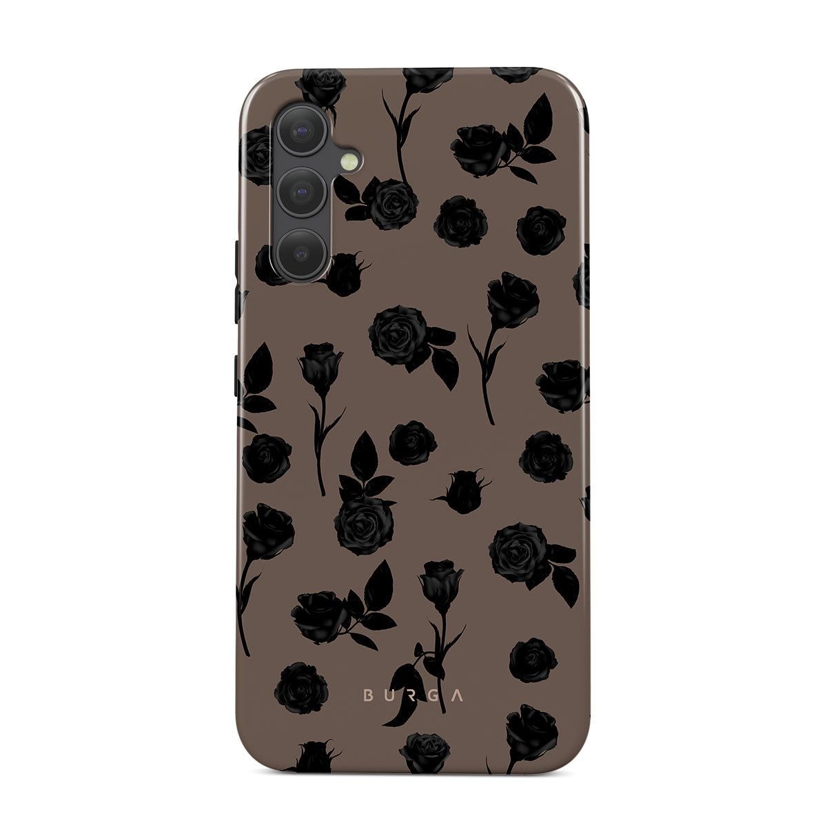 このデザインの特徴は、黒いバラ、大地の色調、フローラルディテール、ダークな花々。