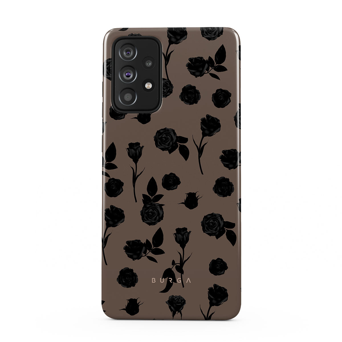 このデザインの特徴は、黒いバラ、大地の色調、フローラルディテール、ダークな花々。