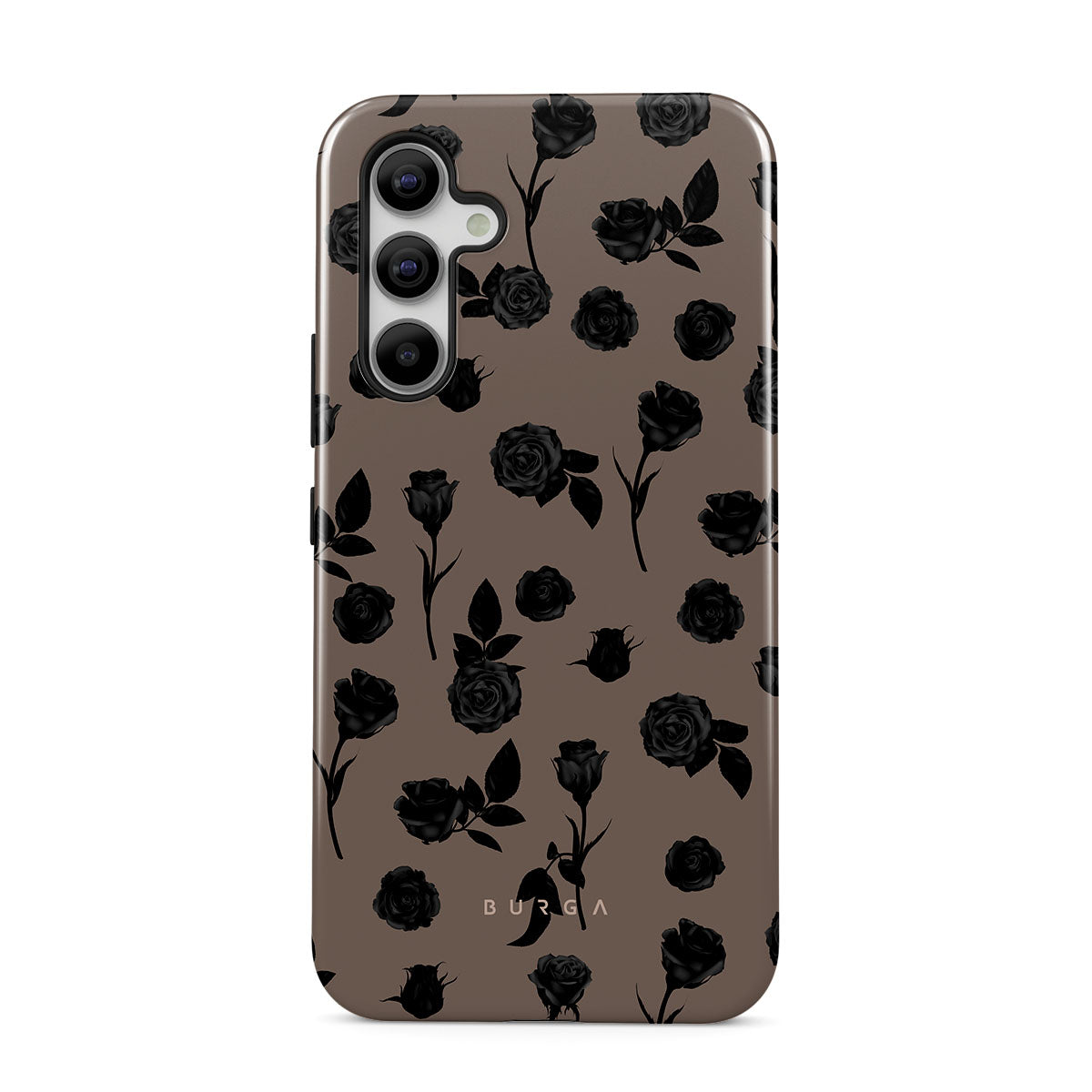 このデザインの特徴は、黒いバラ、大地の色調、フローラルディテール、ダークな花々。