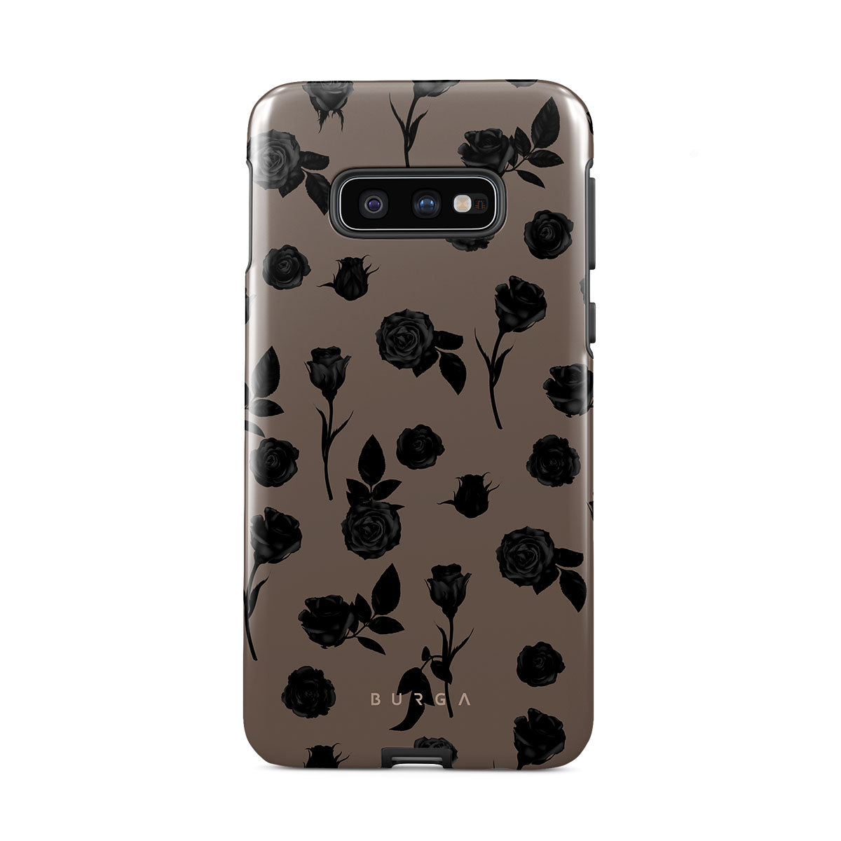 このデザインの特徴は、黒いバラ、大地の色調、フローラルディテール、ダークな花々。