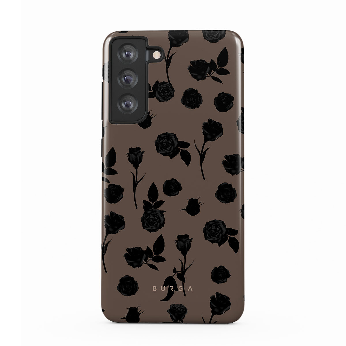 このデザインの特徴は、黒いバラ、大地の色調、フローラルディテール、ダークな花々。