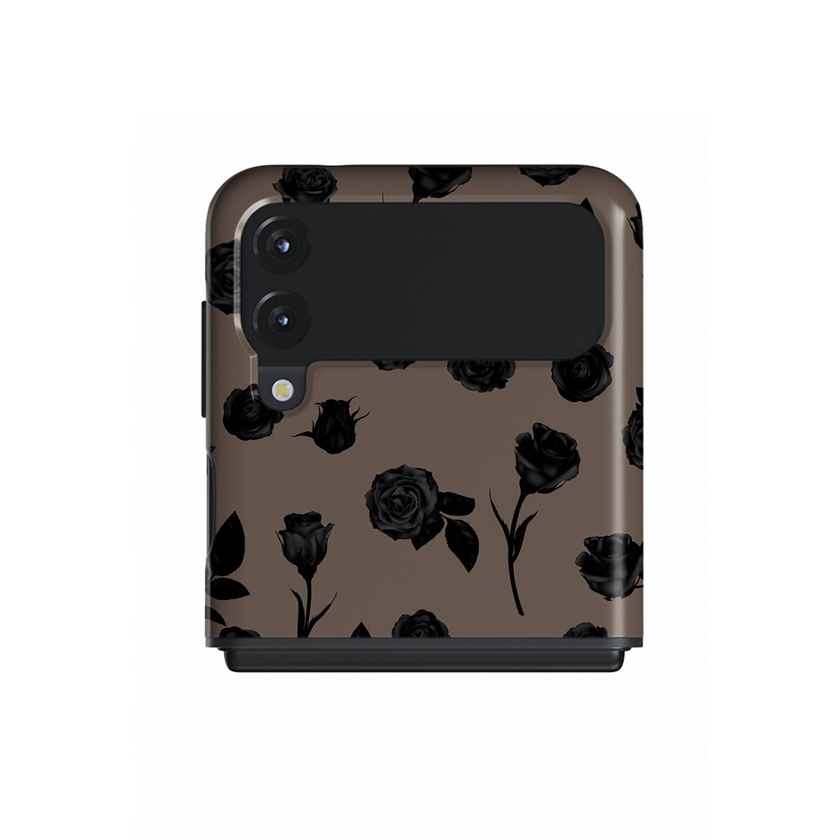 このデザインの特徴は、黒いバラ、大地の色調、フローラルディテール、ダークな花々。