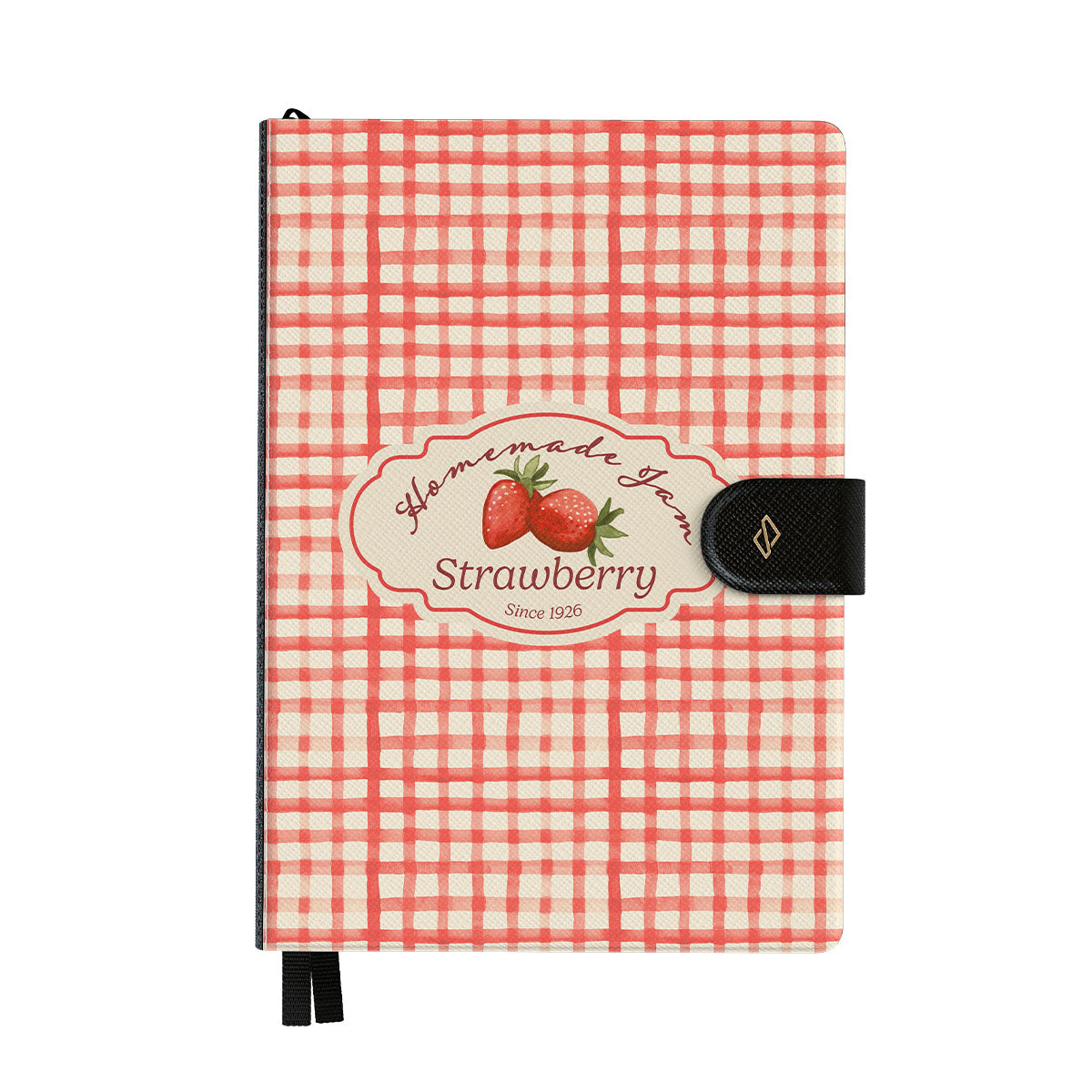 このデザインの特徴:イチゴ、ギンガムチェック、ジャムのラベルイラスト、ヴィンテージなフードグラフィック