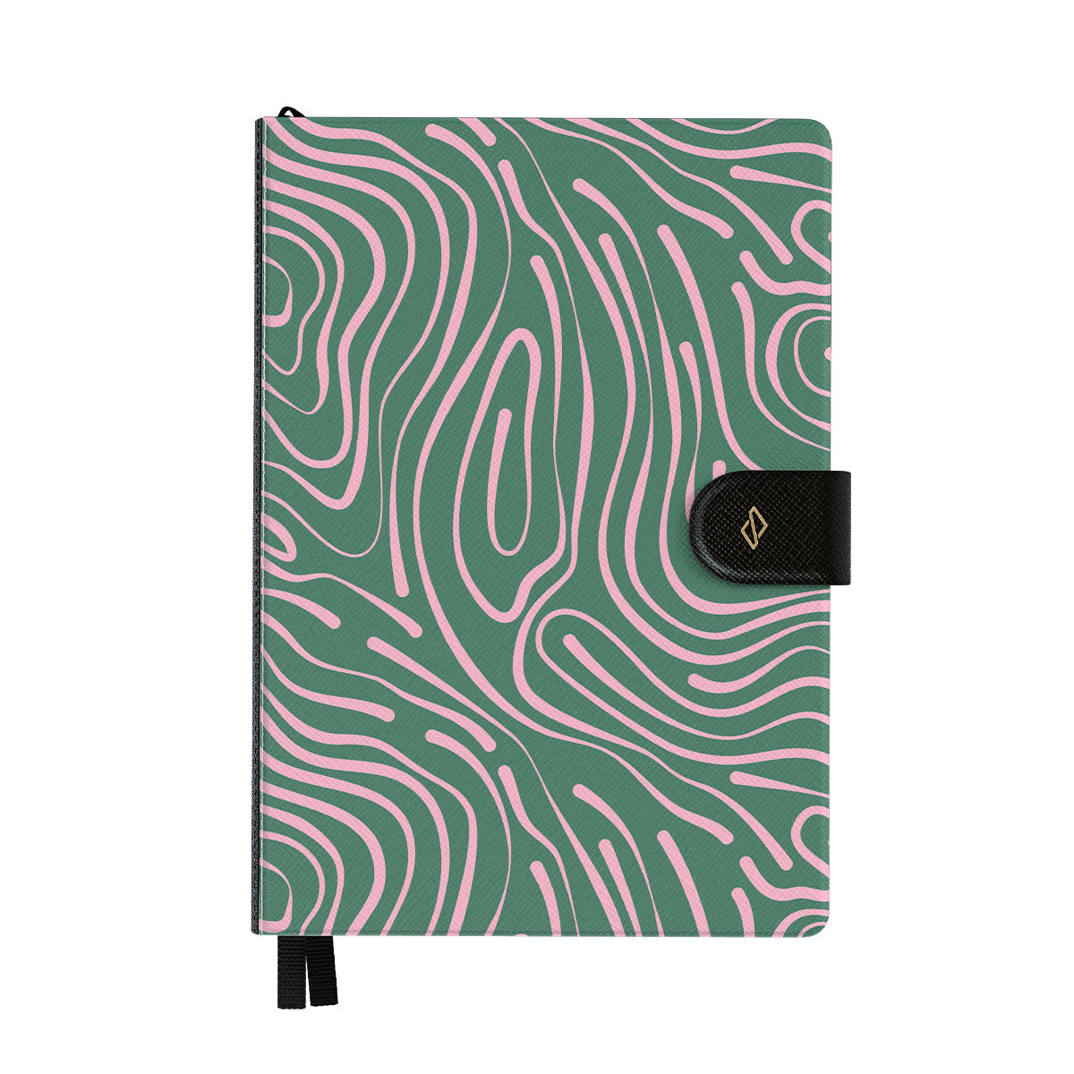 日付が書かれていないミニマリストなデザインで、手帳・スケジュール帳・ダイアリーとして使えます。表紙のハードカバーには、心地よい手触りのヴィーガンサフィアーノレザーを使用。スリムな磁気べえると付きの頑丈な手帳で、コーヒーをこぼしたり、うっかり手帳を落としたりしても安心です。