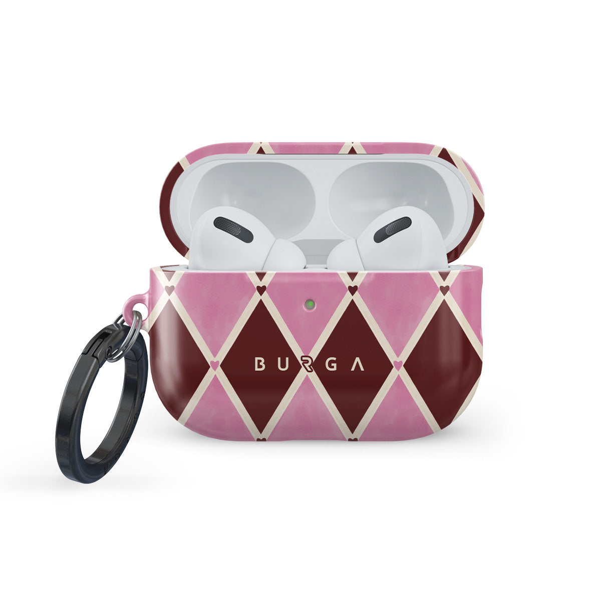 このデザインの特徴ハーレクイン柄、ピンクのダイヤ、深紅の背景