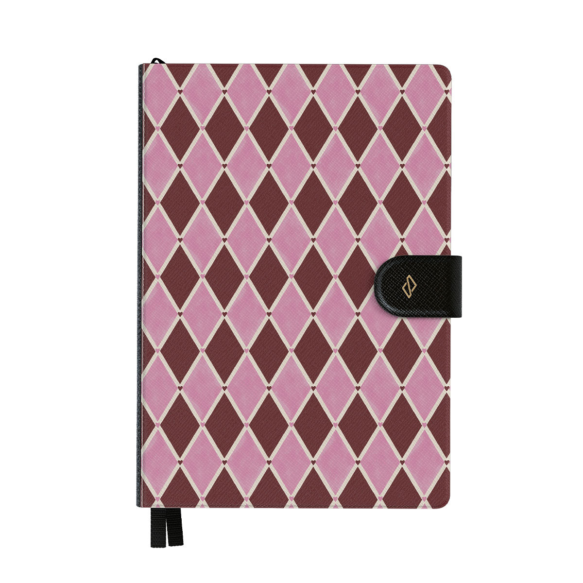 このデザインの特徴ハーレクイン柄、ピンクのダイヤ、深紅の背景