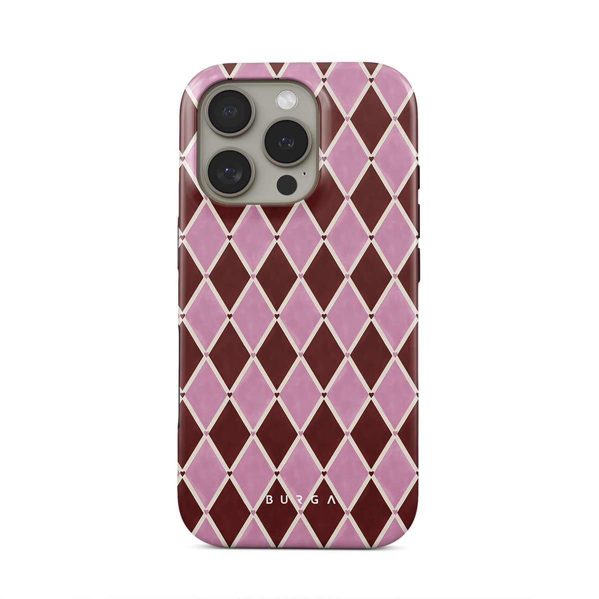 このデザインの特徴ハーレクイン柄、ピンクのダイヤ、深紅の背景