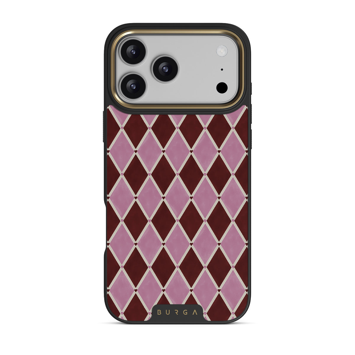 このデザインの特徴ハーレクイン柄、ピンクのダイヤ、深紅の背景
