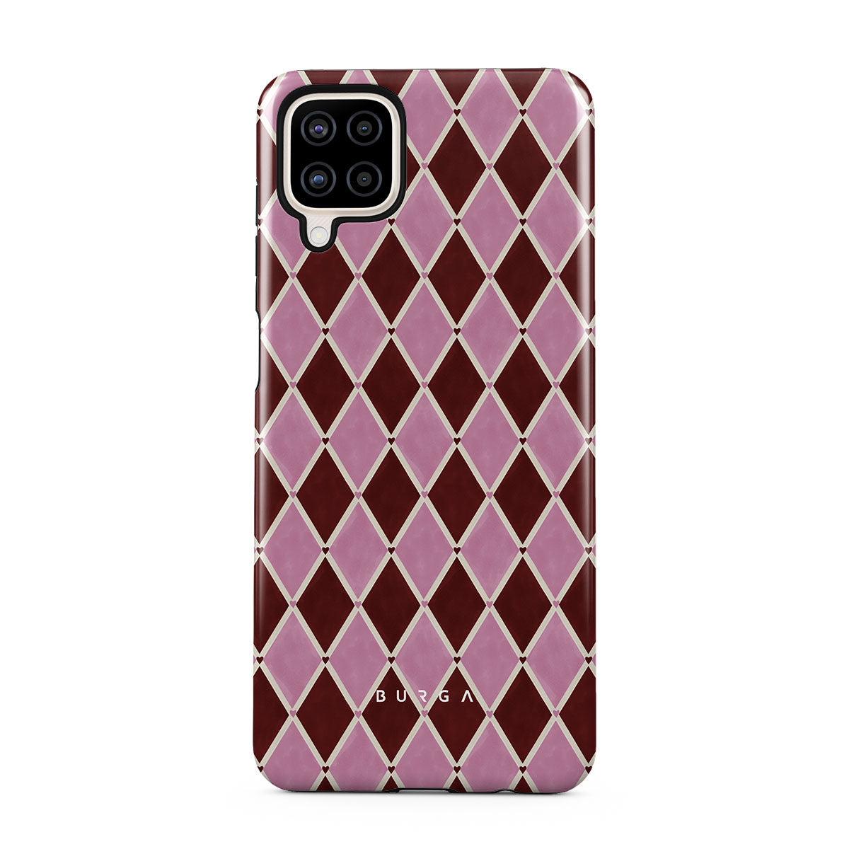 このデザインの特徴ハーレクイン柄、ピンクのダイヤ、深紅の背景