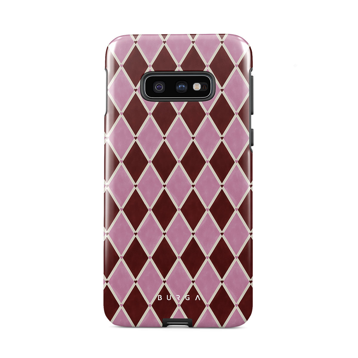 このデザインの特徴ハーレクイン柄、ピンクのダイヤ、深紅の背景