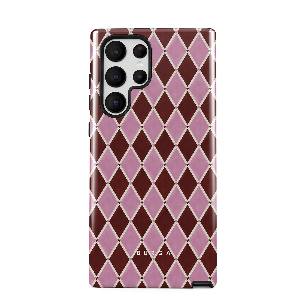 このデザインの特徴ハーレクイン柄、ピンクのダイヤ、深紅の背景