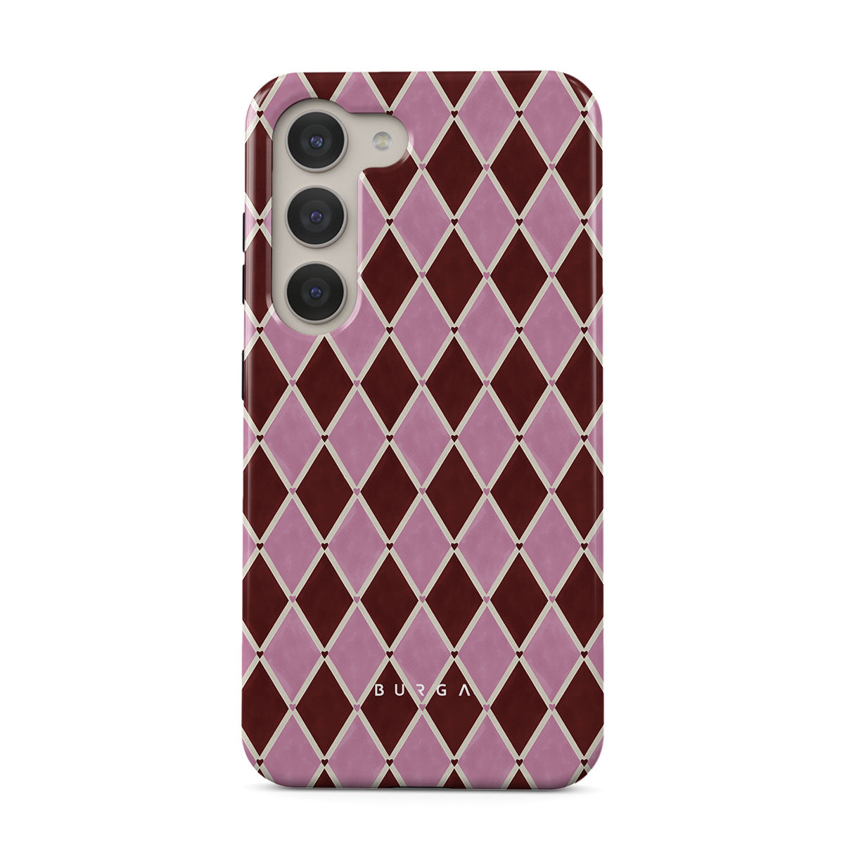 このデザインの特徴ハーレクイン柄、ピンクのダイヤ、深紅の背景