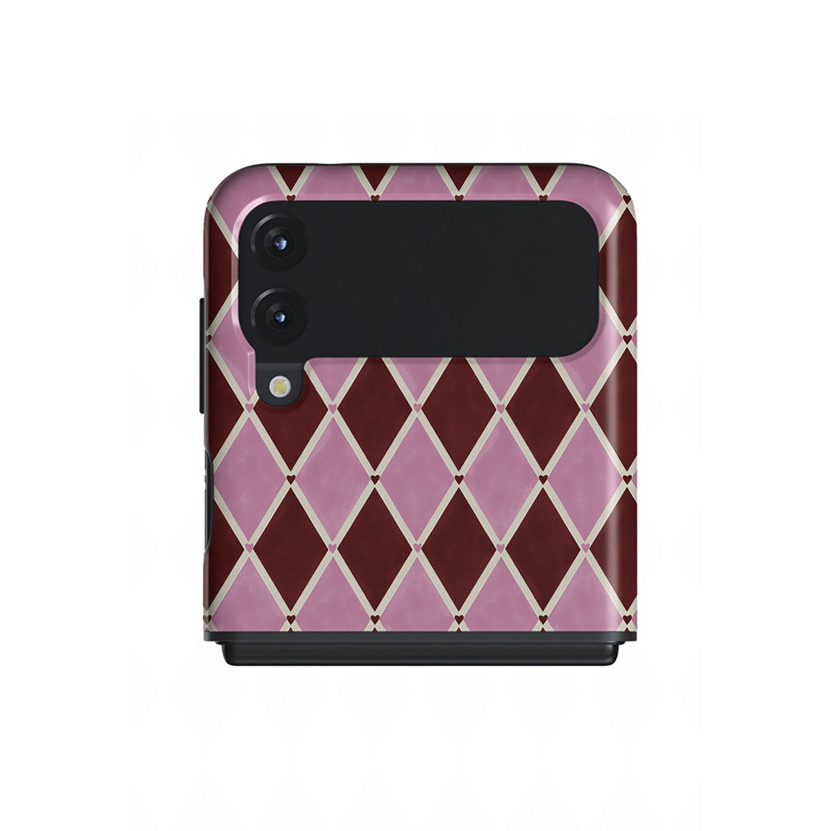 このデザインの特徴ハーレクイン柄、ピンクのダイヤ、深紅の背景