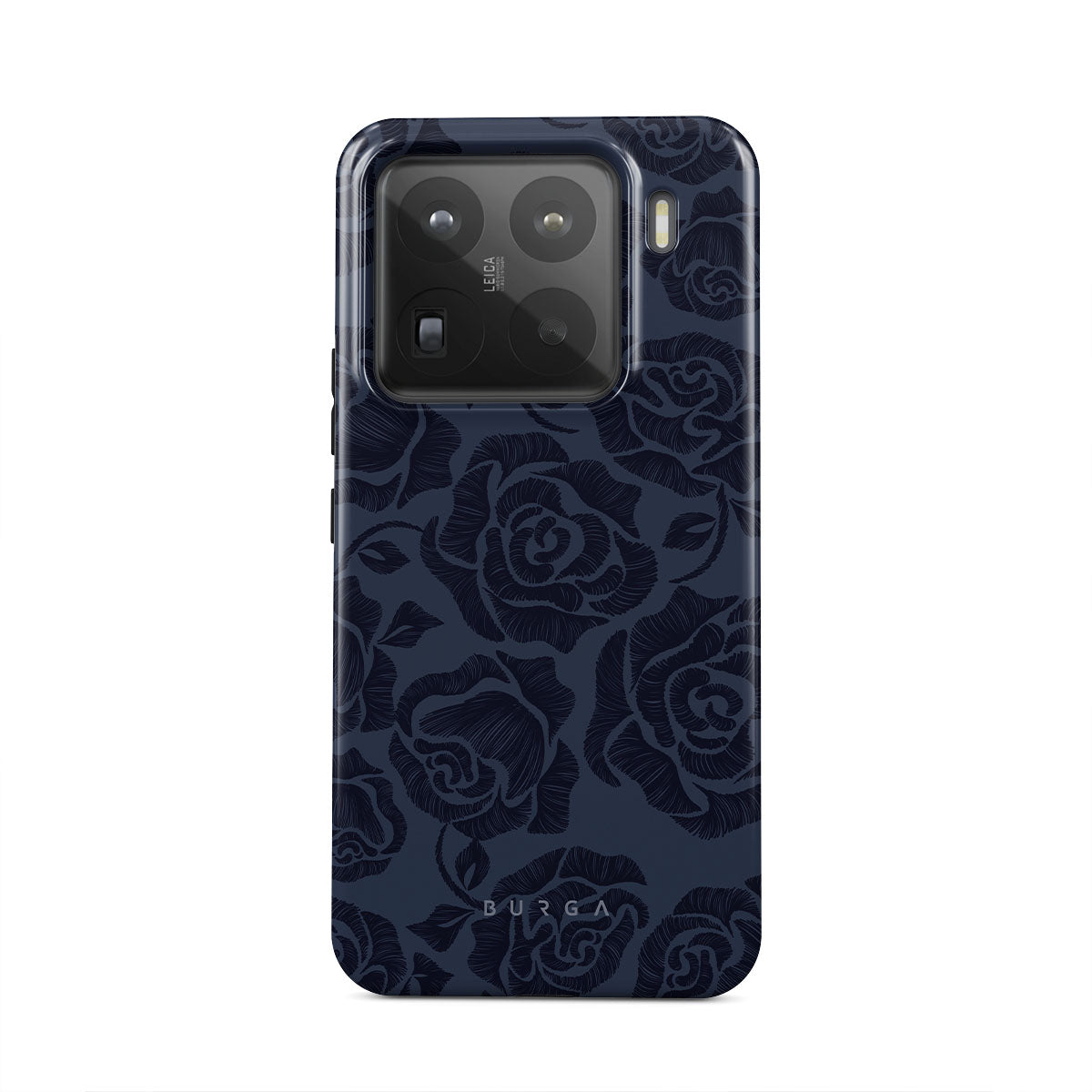 このデザインの特徴は、アネモネ、フローラルプリント、ディープブルーのバラ、シャドウエフェクト。