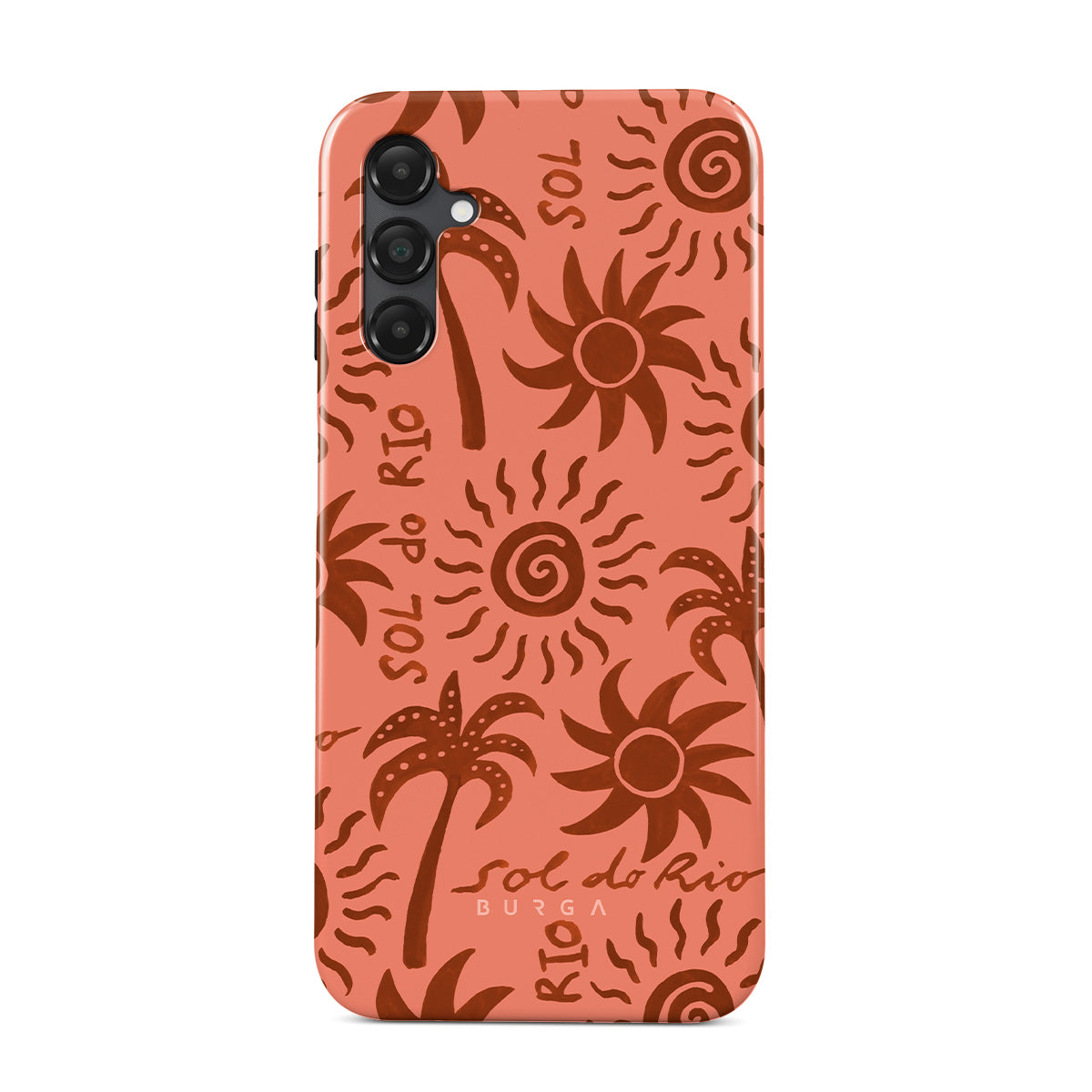 このデザインの特徴:太陽の絵、ヤシの木、抽象的な形、温かいアースカラー