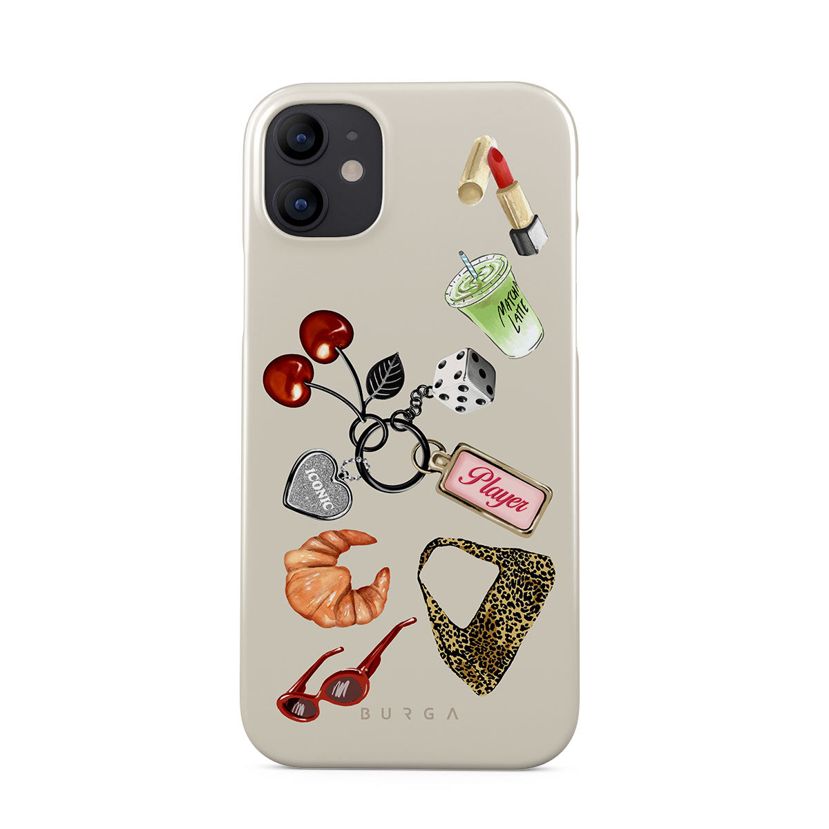 このデザインの特徴:、赤いサングラス、赤いリップ、抹茶ドリンク、クロワッサン、黒いサイコロ、レオパード柄のバッグ、シルバーのハート付きキーチェーン、さくらんぼ、サイコロ、「Player」タグが含まれています。
