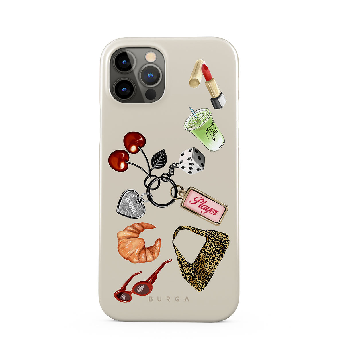 このデザインの特徴:、赤いサングラス、赤いリップ、抹茶ドリンク、クロワッサン、黒いサイコロ、レオパード柄のバッグ、シルバーのハート付きキーチェーン、さくらんぼ、サイコロ、「Player」タグが含まれています。