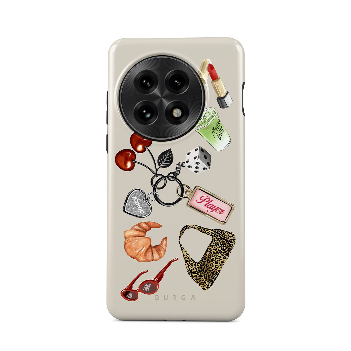 このデザインの特徴:、赤いサングラス、赤いリップ、抹茶ドリンク、クロワッサン、黒いサイコロ、レオパード柄のバッグ、シルバーのハート付きキーチェーン、さくらんぼ、サイコロ、「Player」タグが含まれています。