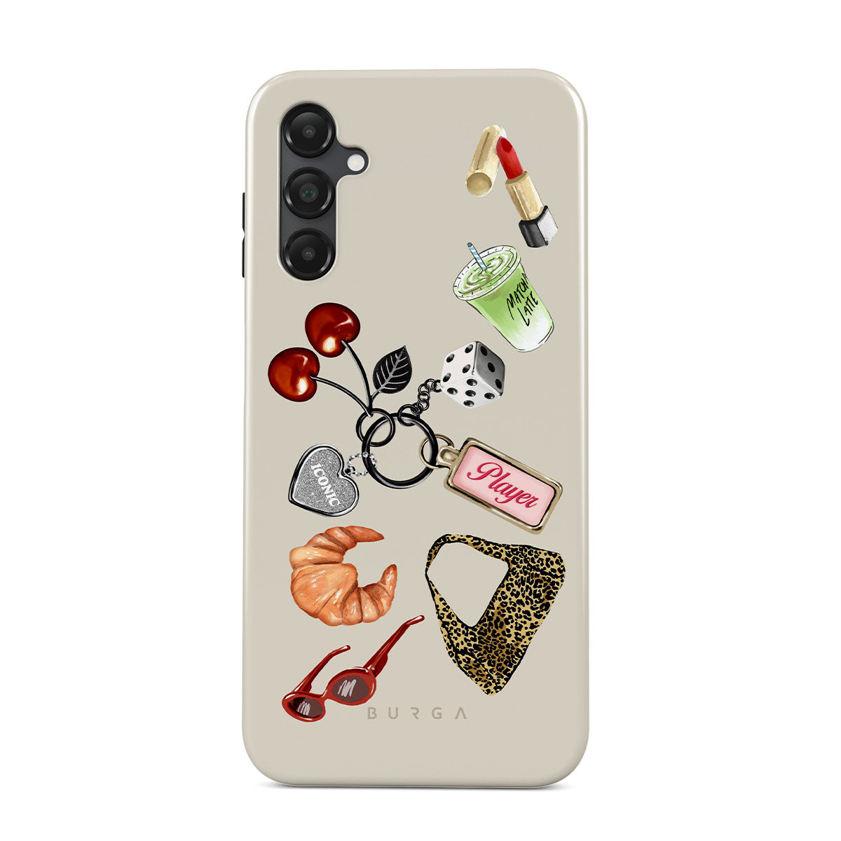 このデザインの特徴:、赤いサングラス、赤いリップ、抹茶ドリンク、クロワッサン、黒いサイコロ、レオパード柄のバッグ、シルバーのハート付きキーチェーン、さくらんぼ、サイコロ、「Player」タグが含まれています。