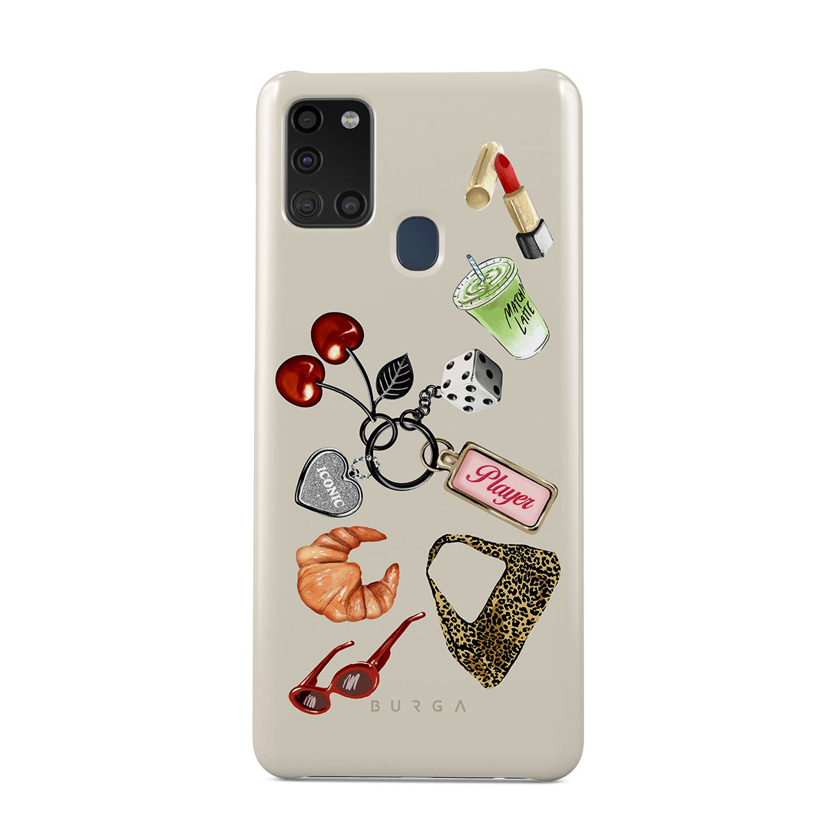 このデザインの特徴:、赤いサングラス、赤いリップ、抹茶ドリンク、クロワッサン、黒いサイコロ、レオパード柄のバッグ、シルバーのハート付きキーチェーン、さくらんぼ、サイコロ、「Player」タグが含まれています。