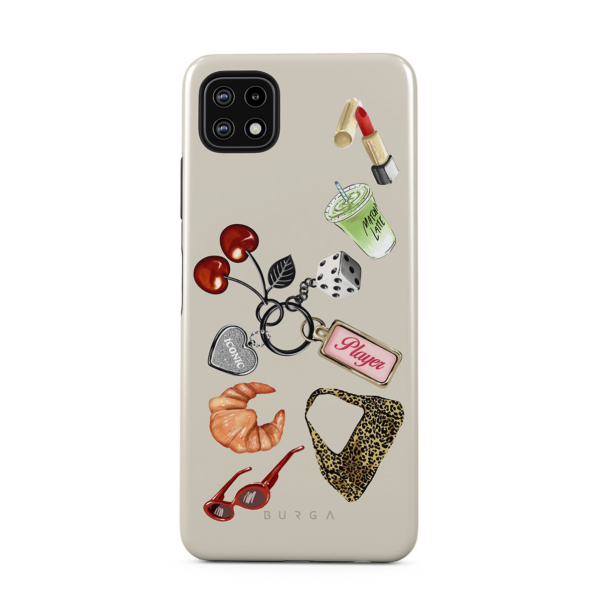 このデザインの特徴:、赤いサングラス、赤いリップ、抹茶ドリンク、クロワッサン、黒いサイコロ、レオパード柄のバッグ、シルバーのハート付きキーチェーン、さくらんぼ、サイコロ、「Player」タグが含まれています。
