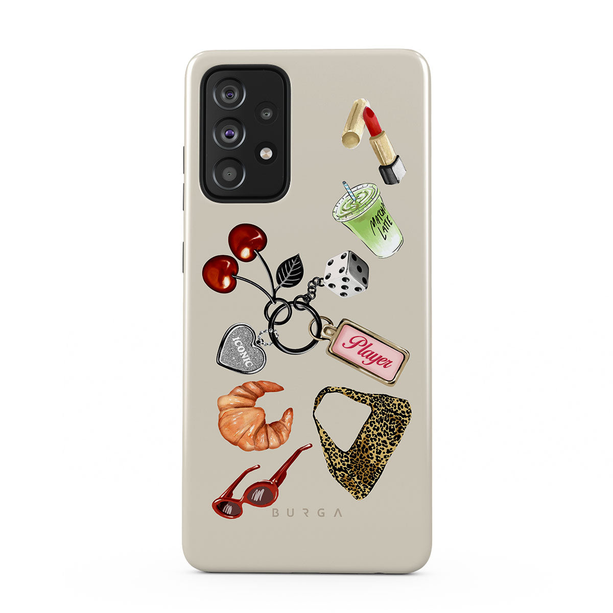 このデザインの特徴:、赤いサングラス、赤いリップ、抹茶ドリンク、クロワッサン、黒いサイコロ、レオパード柄のバッグ、シルバーのハート付きキーチェーン、さくらんぼ、サイコロ、「Player」タグが含まれています。