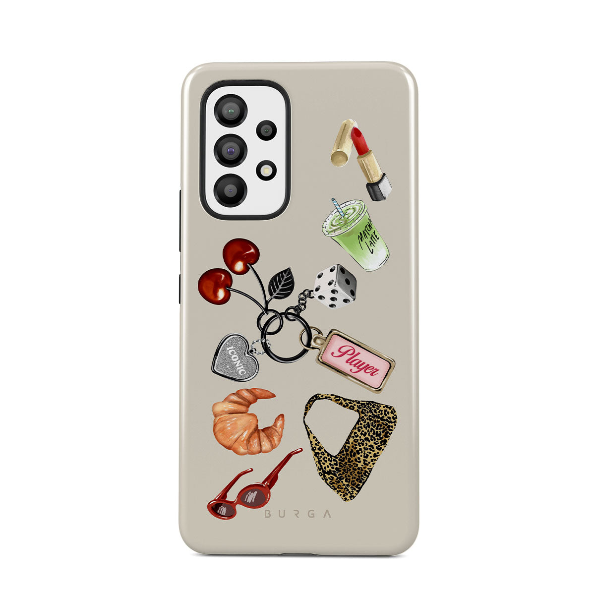 このデザインの特徴:、赤いサングラス、赤いリップ、抹茶ドリンク、クロワッサン、黒いサイコロ、レオパード柄のバッグ、シルバーのハート付きキーチェーン、さくらんぼ、サイコロ、「Player」タグが含まれています。
