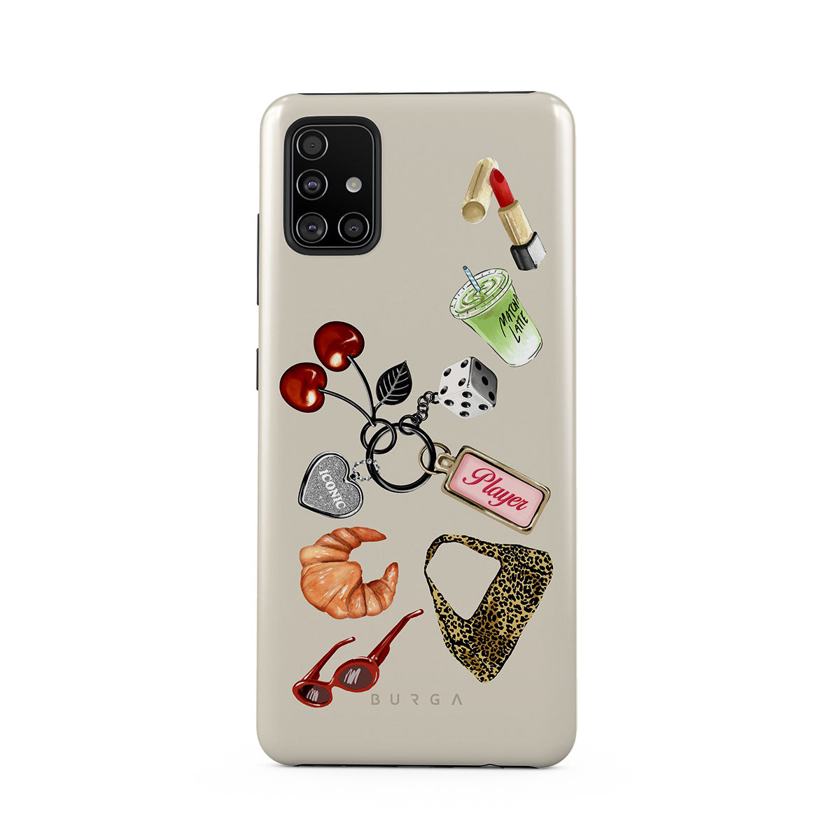 このデザインの特徴:、赤いサングラス、赤いリップ、抹茶ドリンク、クロワッサン、黒いサイコロ、レオパード柄のバッグ、シルバーのハート付きキーチェーン、さくらんぼ、サイコロ、「Player」タグが含まれています。