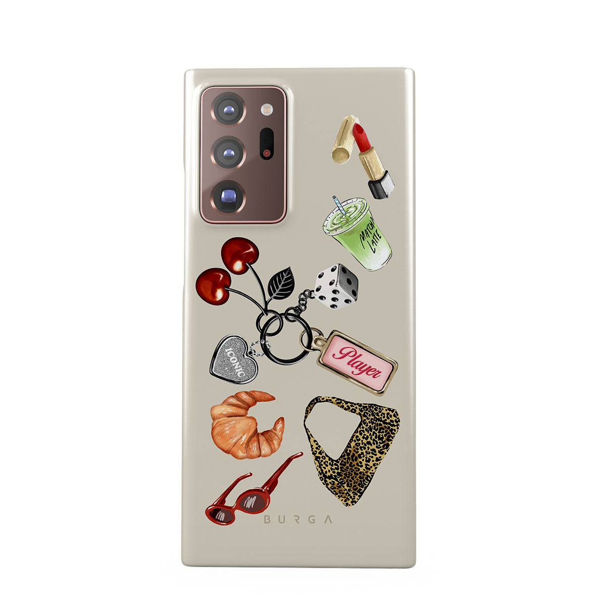 このデザインの特徴:、赤いサングラス、赤いリップ、抹茶ドリンク、クロワッサン、黒いサイコロ、レオパード柄のバッグ、シルバーのハート付きキーチェーン、さくらんぼ、サイコロ、「Player」タグが含まれています。