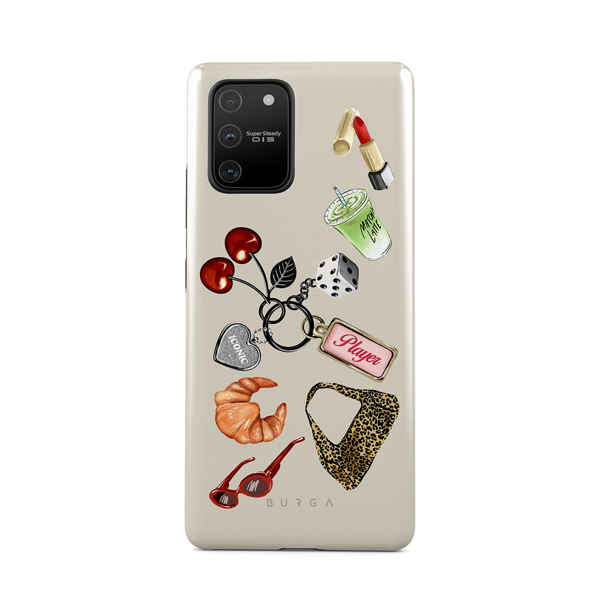 このデザインの特徴:、赤いサングラス、赤いリップ、抹茶ドリンク、クロワッサン、黒いサイコロ、レオパード柄のバッグ、シルバーのハート付きキーチェーン、さくらんぼ、サイコロ、「Player」タグが含まれています。