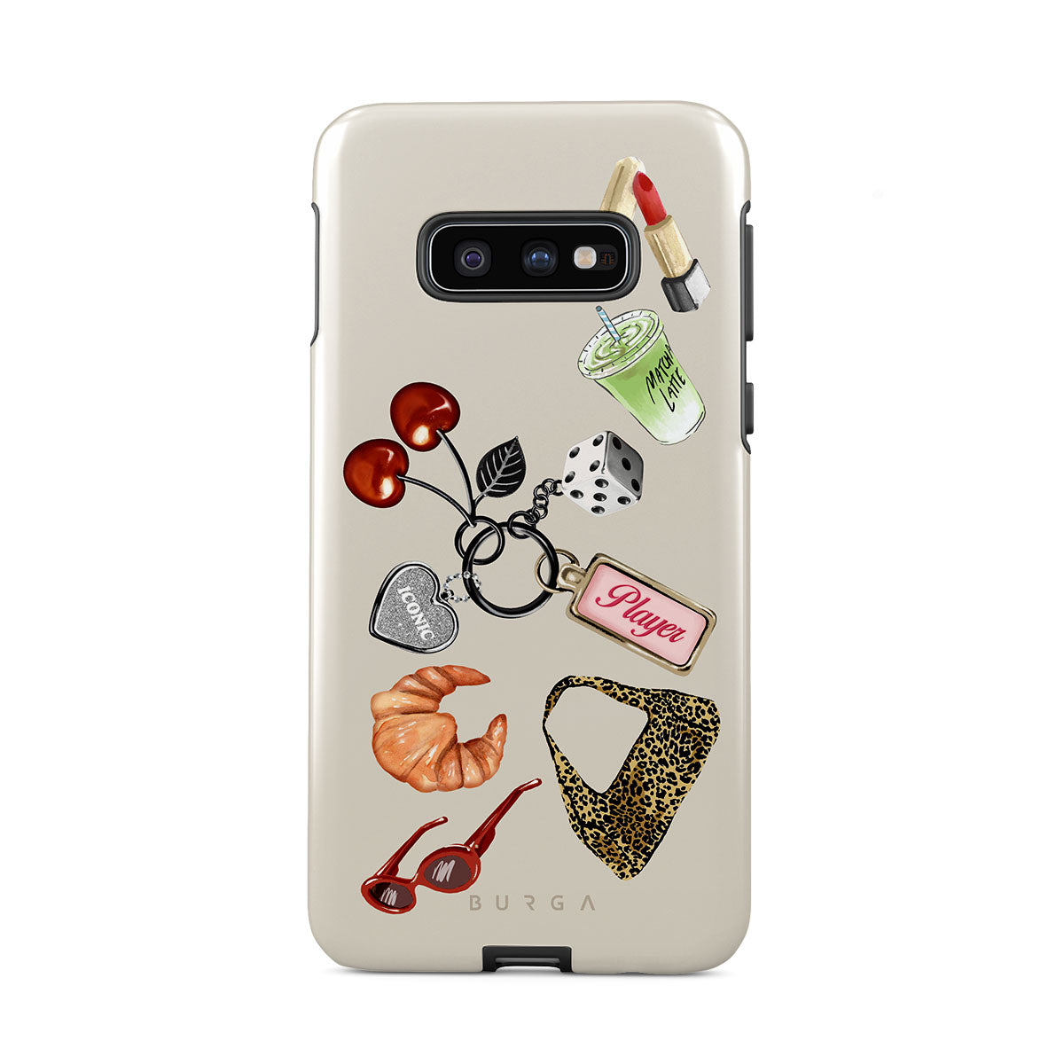 このデザインの特徴:、赤いサングラス、赤いリップ、抹茶ドリンク、クロワッサン、黒いサイコロ、レオパード柄のバッグ、シルバーのハート付きキーチェーン、さくらんぼ、サイコロ、「Player」タグが含まれています。