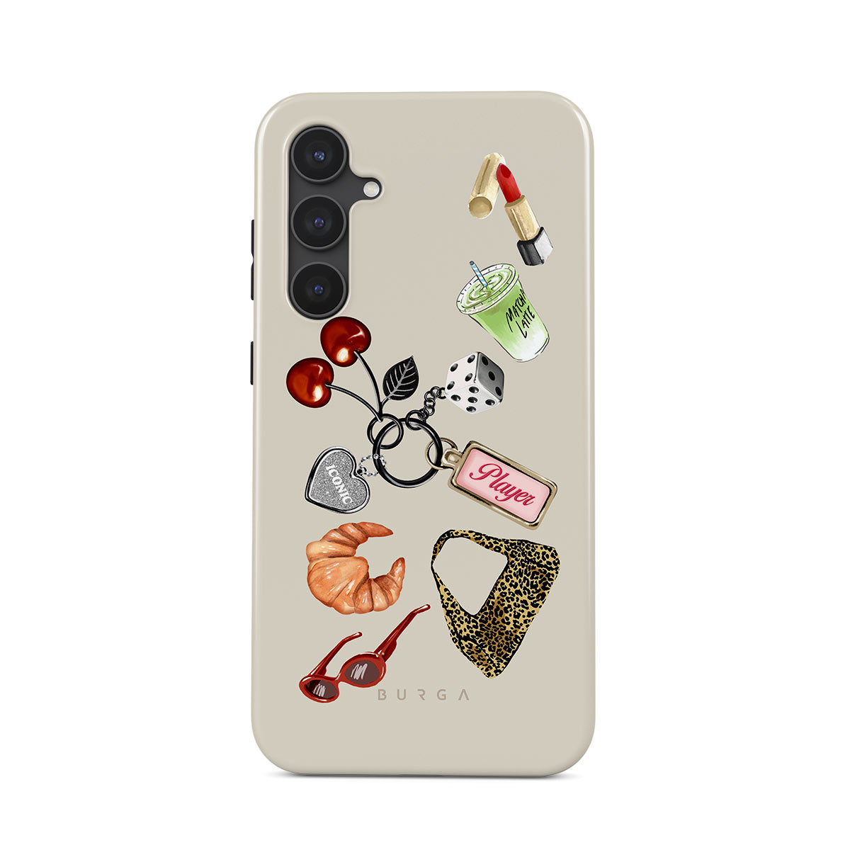 このデザインの特徴:、赤いサングラス、赤いリップ、抹茶ドリンク、クロワッサン、黒いサイコロ、レオパード柄のバッグ、シルバーのハート付きキーチェーン、さくらんぼ、サイコロ、「Player」タグが含まれています。