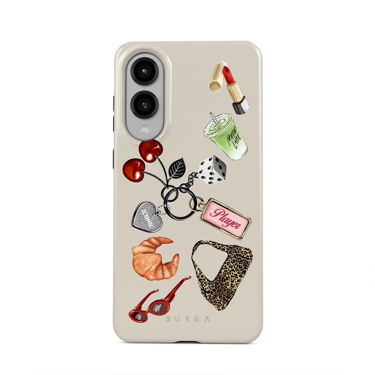 このデザインの特徴:、赤いサングラス、赤いリップ、抹茶ドリンク、クロワッサン、黒いサイコロ、レオパード柄のバッグ、シルバーのハート付きキーチェーン、さくらんぼ、サイコロ、「Player」タグが含まれています。