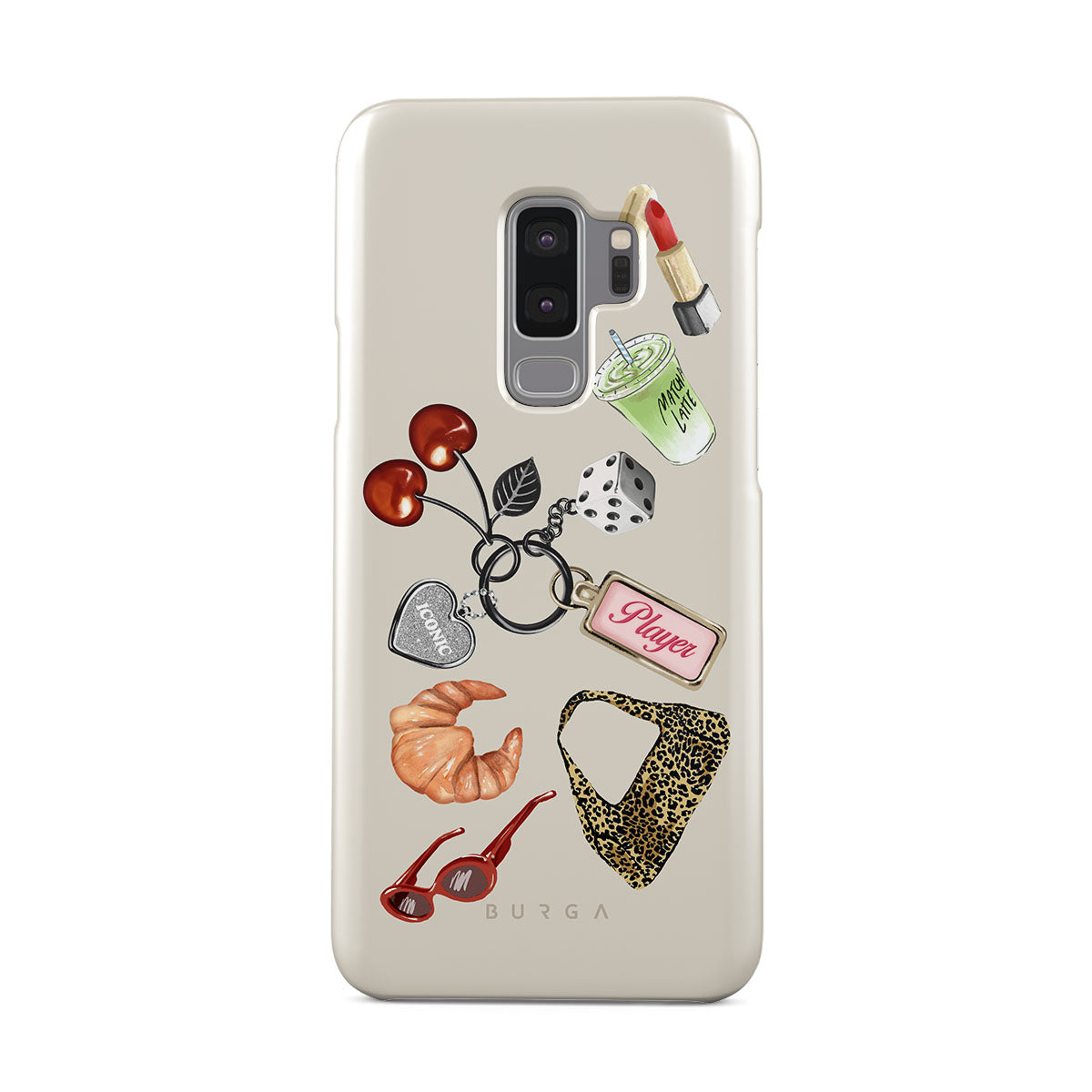 このデザインの特徴:、赤いサングラス、赤いリップ、抹茶ドリンク、クロワッサン、黒いサイコロ、レオパード柄のバッグ、シルバーのハート付きキーチェーン、さくらんぼ、サイコロ、「Player」タグが含まれています。