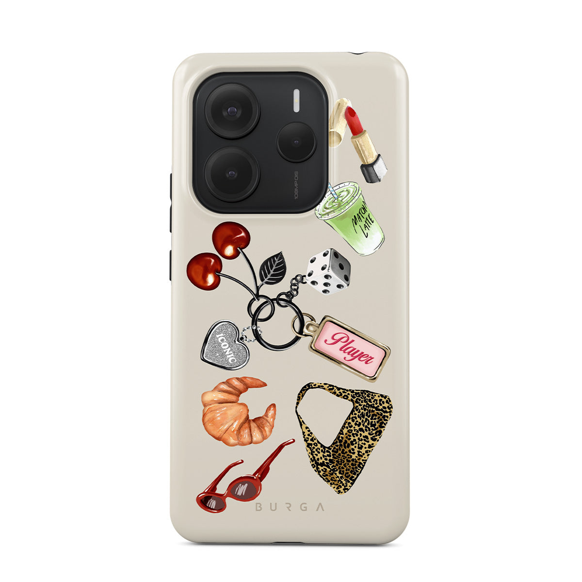 このデザインの特徴:、赤いサングラス、赤いリップ、抹茶ドリンク、クロワッサン、黒いサイコロ、レオパード柄のバッグ、シルバーのハート付きキーチェーン、さくらんぼ、サイコロ、「Player」タグが含まれています。