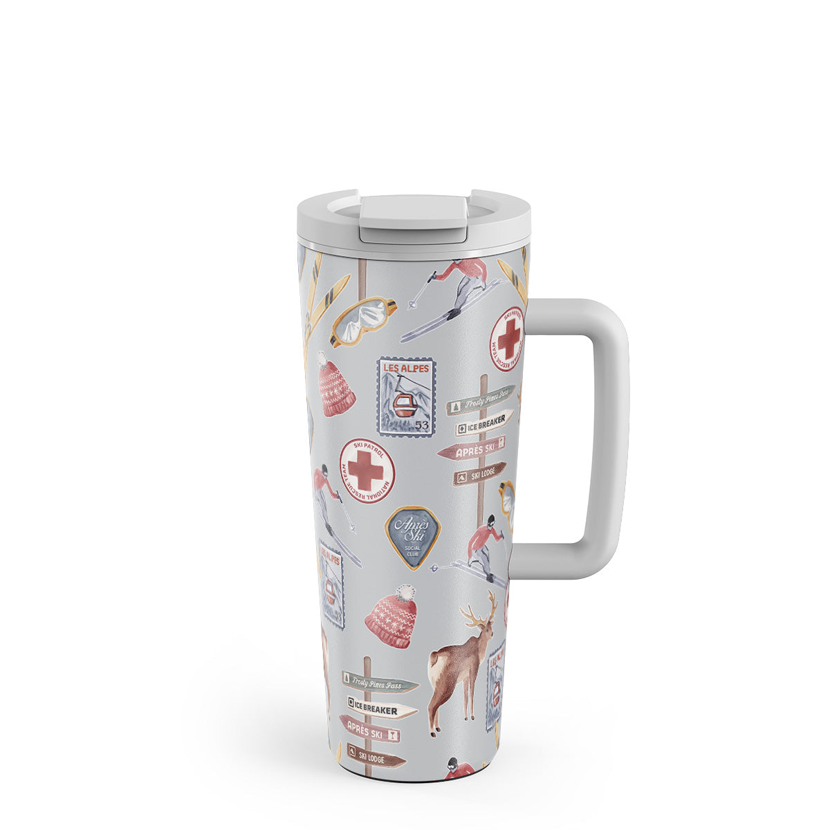 このデザインの特徴:ヴィンテージのスキーポスターレトロなスキーリゾート、トナカイのイラスト、スキーリフトデザイン、アルプスのパターン、冬のスポーツ、クラシックなスキー小屋スタイル、山のリゾートグラフィックス