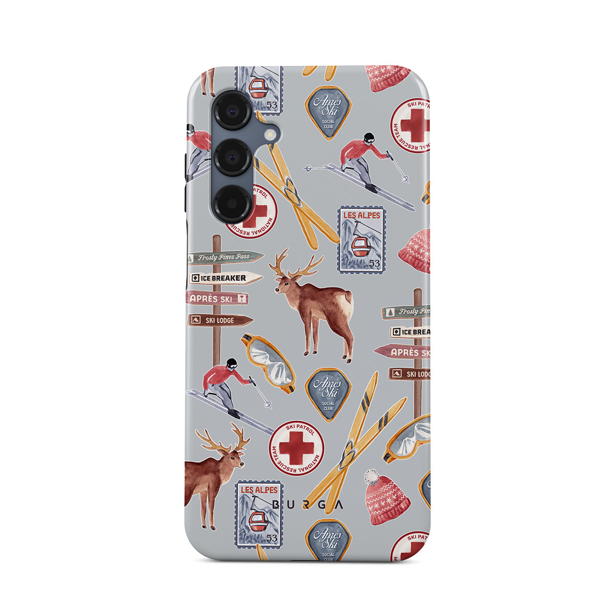 このデザインの特徴:ヴィンテージのスキーポスターレトロなスキーリゾート、トナカイのイラスト、スキーリフトデザイン、アルプスのパターン、冬のスポーツ、クラシックなスキー小屋スタイル、山のリゾートグラフィックス