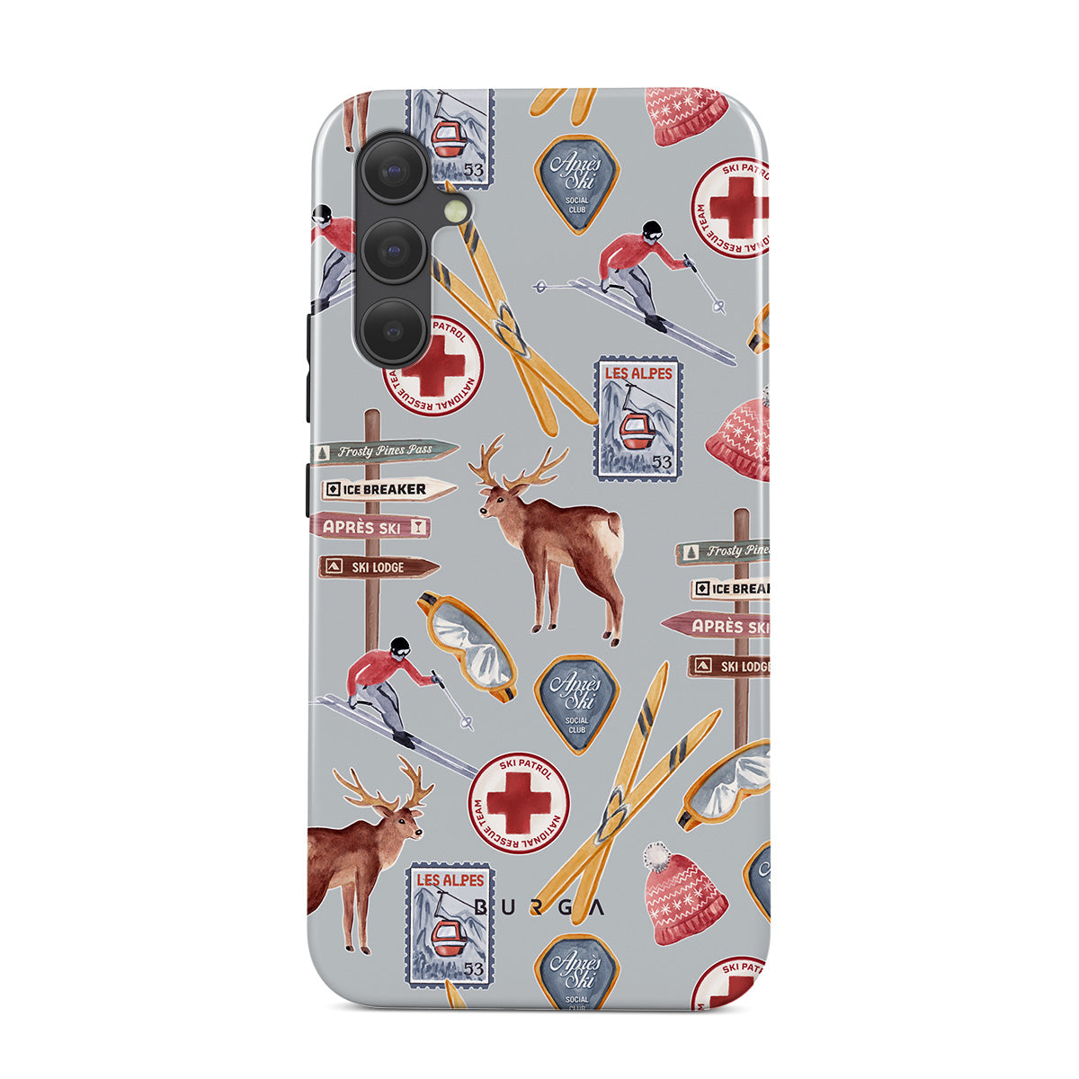 このデザインの特徴:ヴィンテージのスキーポスターレトロなスキーリゾート、トナカイのイラスト、スキーリフトデザイン、アルプスのパターン、冬のスポーツ、クラシックなスキー小屋スタイル、山のリゾートグラフィックス
