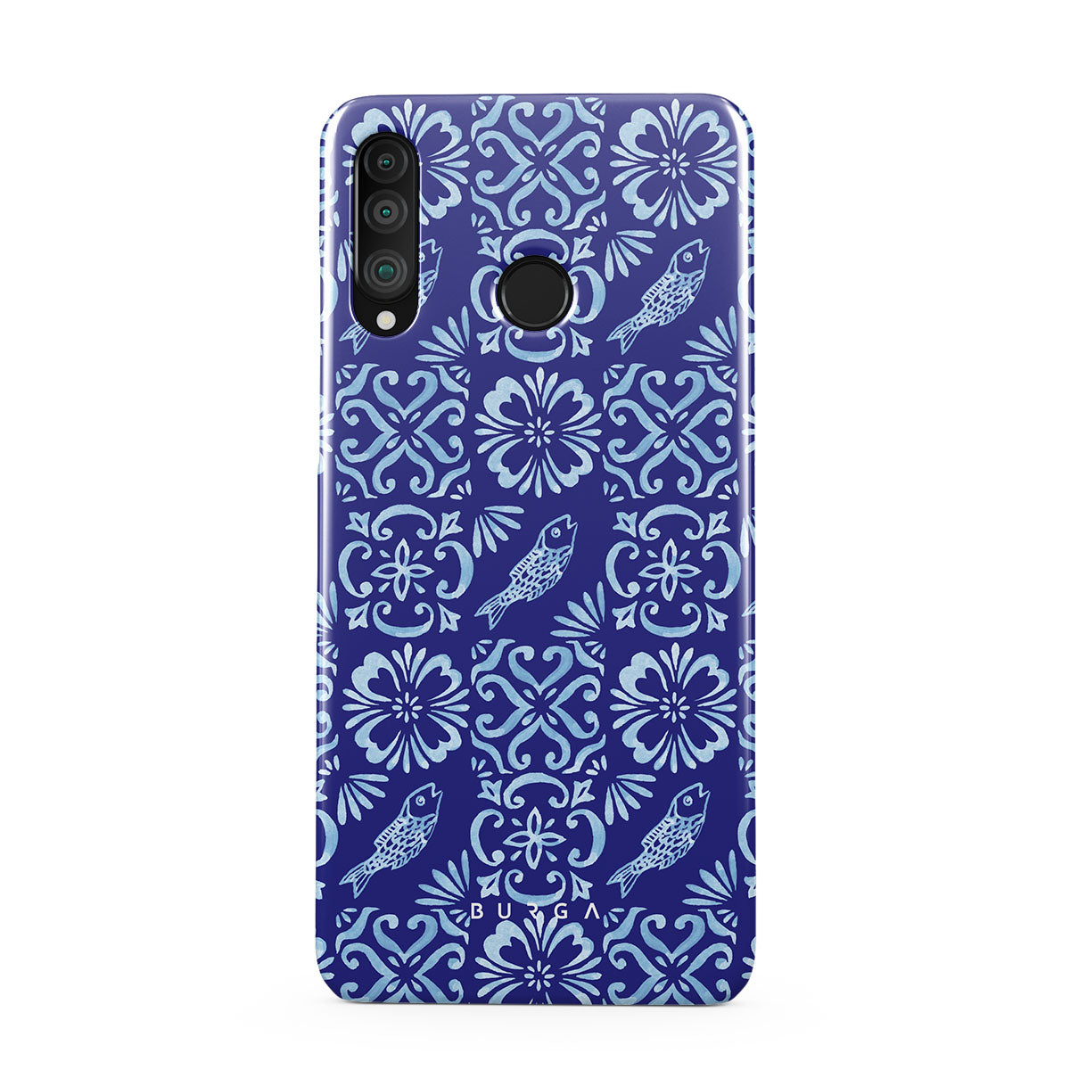 このデザインの特徴:ポルトガルのタイル模様、深い青、花柄、花、魚