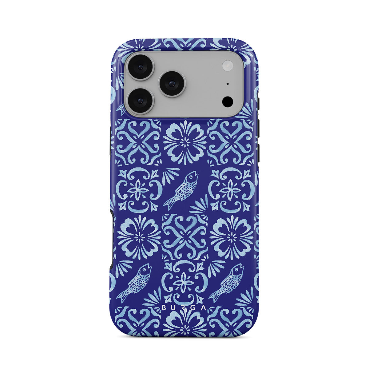 このデザインの特徴:ポルトガルのタイル模様、深い青、花柄、花、魚