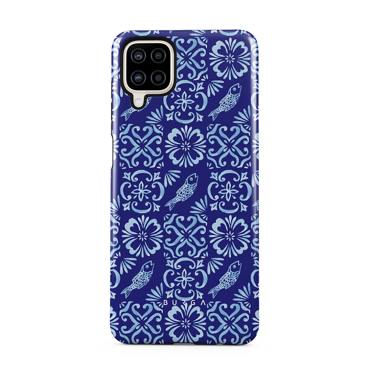 このデザインの特徴:ポルトガルのタイル模様、深い青、花柄、花、魚