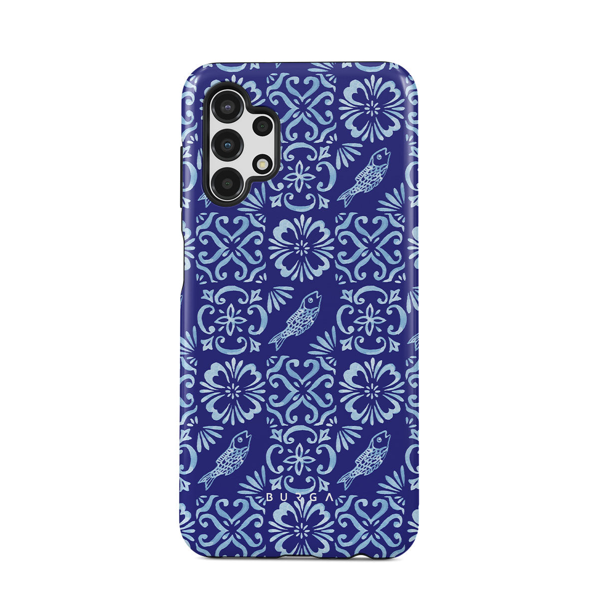 このデザインの特徴:ポルトガルのタイル模様、深い青、花柄、花、魚