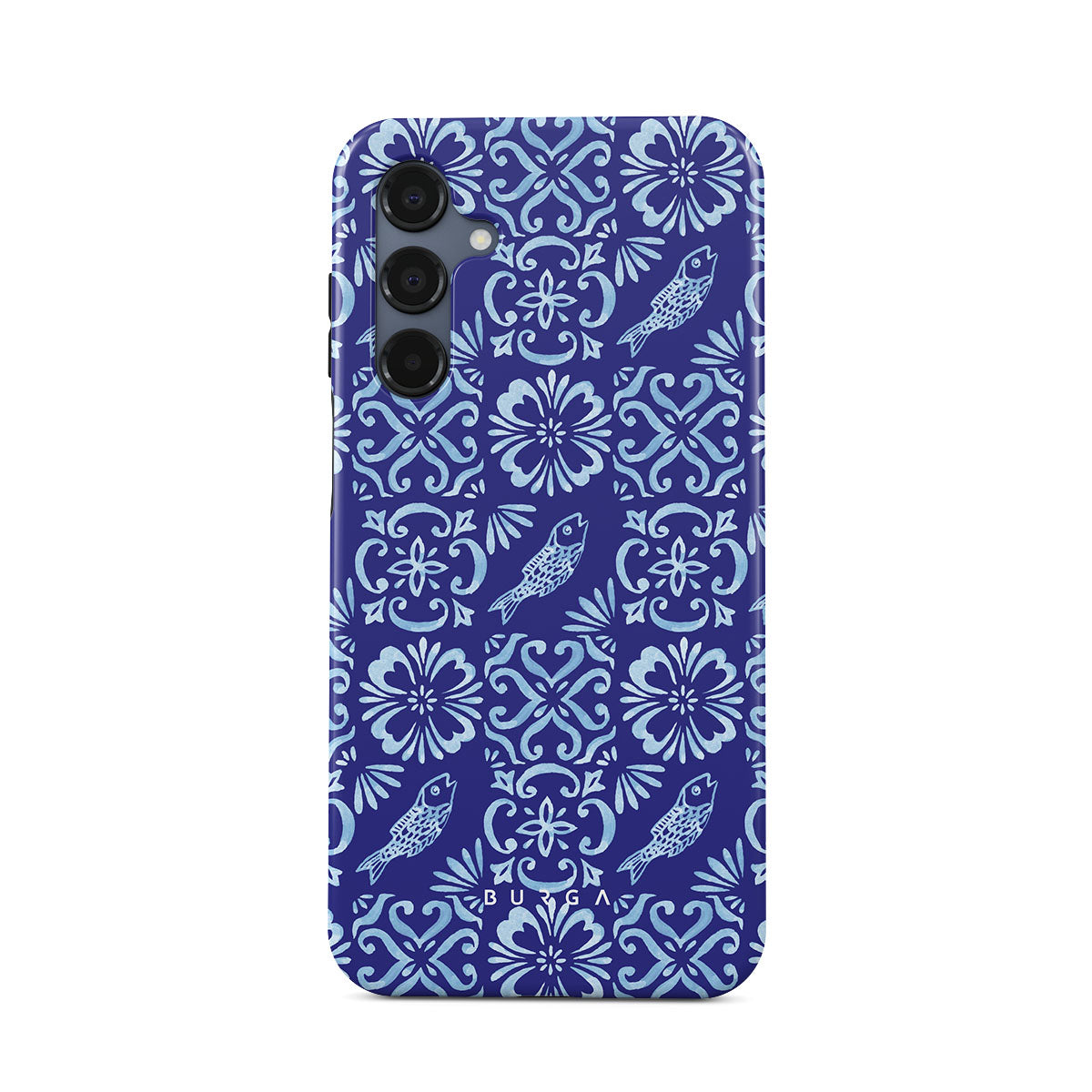 このデザインの特徴:ポルトガルのタイル模様、深い青、花柄、花、魚