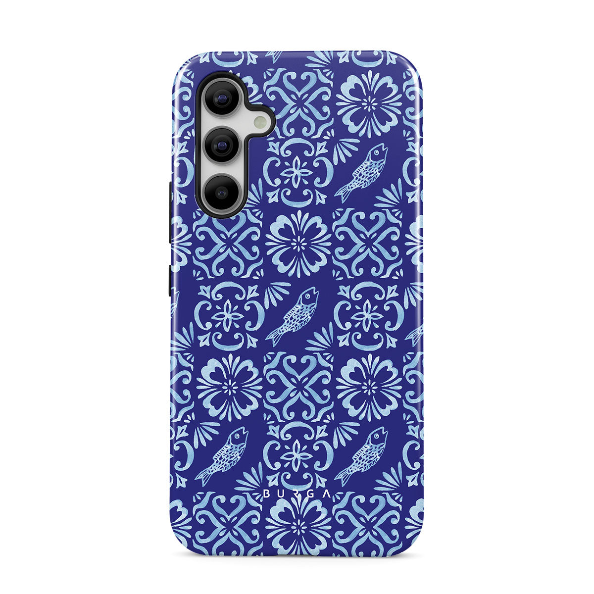 このデザインの特徴:ポルトガルのタイル模様、深い青、花柄、花、魚